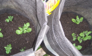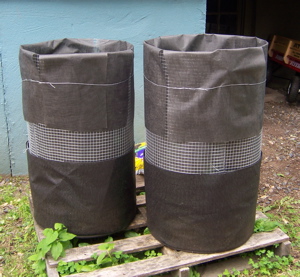 So. We developed a plan. We have no experience growing potatoes, so we’re guessing. We stretched some chicken wire around the inside of the pots and the bags, securing the column with loose wire. Then we draped weed fabric around the sides so we can shovel dirt without it falling out everywhere. I set up the last column today and my arms are covered with wire scratches, but if it works, I’ll hardly miss my epidermis.