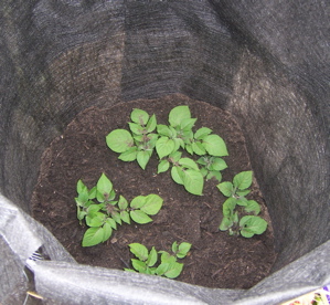For two weeks after we planted the potatoes nothing happened. I worried. I fretted. I wrote pitiful laments. When bold green shoots suddenly appeared, I rejoiced; the shoots soon turned to leaves. The idea was to wait four inches, then cover the stems with dirt and compost so the stems turned into roots. I mounded. I re-mounded. Suddenly, I could not re-mound the soil fast enough and some leaves were almost level with the top of the potato bags and planters. Pete and I realized we had to add some vertical distance for our tubers to travel.