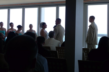 Tata: We got dressed in a room the size of prison cell and drove over to this barn on the beach at Long Branch, which is so corporate we checked the ocean for sponsors. The wedding took about fifteen minutes in a room overlooking the ocean that was set up for another wedding. I don’t know what we were doing there. Anyway, minutes later, we piled into cars and drove four miles back to the Holiday Inn. It was about 90 degrees, my AC’s broken and Route 36 was wall-to-wall construction, rush hour and shore traffic, so the ride took almost an hour, by which time my hair was a foot high. I pinned it down with a barrette but I looked like the Contadina lady’s mother-in-law in kitten heels.