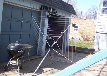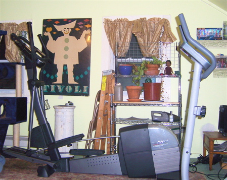 Behold: the secondhand elliptical. We scoured classifieds for months and finally found one nearby and at a very, very reasonable price. Then we zipped around trying to find a way to transport the thing a mile and a half. Things looked bad; things looked worse. Renting a truck seemed stupid when we had wrenches. Then we carried the elliptical in pieces up to the attic, where it sits next to the stationary bike and the rowing machine, both of which we totally use. Tomorrow morning, at a stupid hour when it’s still dark out, I’ll give it a go. Yippee! My hip is totally creaky. My abs will forget about Jessica Simpson.