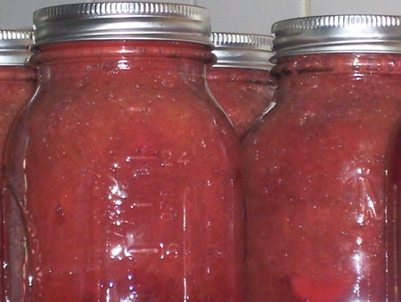 That’s strawberry-rhubarb pie filling. Working up your own recipes for jarring is supposed to be very bad juju, fraught with perilous peril, unless you’ve been jarring since before you could tie your own apron strings. Thing is: sometimes you can go from book to book to book and find recipes filled with crap you’re not interested in eating; such was the case with rhubarb pie filling. I was not at all interested in including thickeners other than sugars, since I couldn’t find anyone making a case that the additional ingredients affected the pH and I would prefer my jarred pie fillings not congeal in the jar. Dude: it’s hard to get gelatin out of a quart jar and I develop needless hostility for delicious fruit. No, I want to open a jar of fruit like peaches, toss that into a pie crust, open a jar of pie filling and pour that on top without a fight or unnerving SLOOSHing sounds. Then I want to roll out a top crust, crimp that bad boy and bake it until it sings to me because, dagnabbit, in January, pink pie might save your life. Back to my point: I found recipes for rhubarb preserves and strawberry preserves, both of which included only fruit and sugar, that’s it. So I macerated the strawberries, macerated the rhubarb, cooked them a little, put a tablespoon of lemon juice in each jar, and poured in gently simmered fruit. The jars processed for half an hour, which seemed sensible. The flip side of working up a recipe is that I have to be prepared to accept it if I’ve fucked up. So okay: if I open a jar and the pink pie filling’s turned a startling fuzzy blue I have no one to blame but myself. If it’s tasty, though, I shall be impossible to live with.