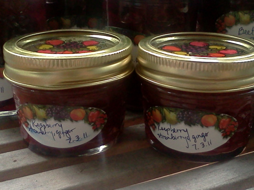 Pete said something geniouser: buy some strawberries. I didn’t love the strawberries I was seeing but I was anxious to get those berries out of my damn fridge before they melted into disaster and reproach. I hadn’t found a recipe, but with Pete’s and Minstrel Boy’s help, I’d worked out the principles of constructing one. Next thing I knew, the tiny pint-ish of raspberries and the pint of strawberries became four 4 oz. jars of bright red goo. If the jars don’t pop and turn blue, I might really have learned something worth knowing.