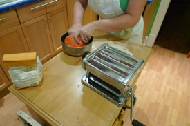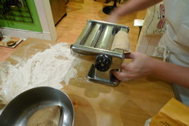 is what happens when we experiment with new ingredients. Specialty pasta flour is two parts Durham or All Purpose flour and one part semolina. When we couldn’t get pre-mixed pasta flour, we bought the best white whole wheat flour – also Hodgson Mills – because we want to cook with and eat whole wheat flour. The hard part for us has been acquiring good semolina, but we found a Greek grocery store carries semolina. We have trouble getting out of that store because the proprietor’s mother bakes olive oil cookies that smell like pillowy, cushiony, cocoa sin. As an experiment, we tried mixing up a dough of two parts white whole wheat flour and one part hostage-free semolina in the Hodgson Mills Pasta Flour recipe. It rested overnight in our fridge and we went to work.