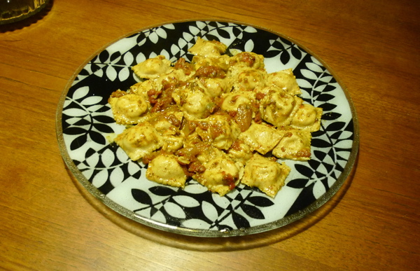 This dinner started with about four or five ounces of leftover ground lamb. What can you do with it? You can make a sauce for something or you can make ravioli, so we chose the pasta. We were thrilled with the two-flour pasta dough and mixed up a cannister of our own pasta flour, so we’re ready for awkward leftovers.