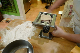 I have small hands. We find that if we roll out a ball of dough that fits in my hand, about a quarter or third of a cup, we end up with a versatile sheet of dough. Immediately, I was surprised by the texture of the dough. It had a nice elasticity and rolled beautifully. The first thing you do with ravioli dough is the same thing you do with any pasta dough: roll it through the machine three times at the widest setting.