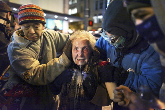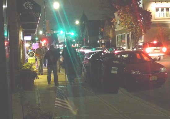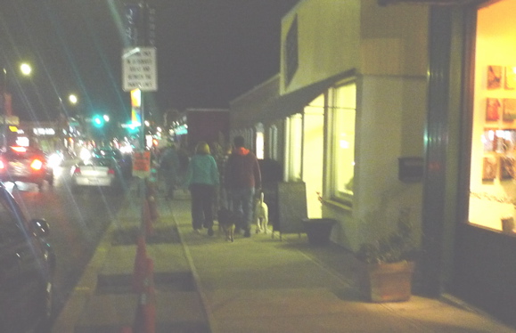 Eventually, the marchers stopped tweeting where they were and what they’d decided. For about three hours, we couldn’t figure out what to do and reluctantly went about the business of being us waiting for something nobody knew what to do for. About. To. It doesn’t make any difference. We waited, waited, waited, went to dinner, picked up dinner for my sisters, waited, waited, made plans, waited, waited. Suddenly, a little guy on bike skidded to a halt in front of my sisters Anya and Corinne, Pete, Brian and me and said, “They’re a block back.” We believed him because the blocks are very short in town and we could see a bunch of kids we knew jumping up and down on the corner. Pete took pictures as the first marcher declared, “Ninety-nine percent coming through!” We cheered and slapped hands with them. They implored us to march with them, even a little way. Friends of ours who are dogs and their people brought up the rear of the group and when we turned to look back, Anya, Corinne and Brian were gone in a flash. No, literally, a flash: Pete took the picture below and then I noticed the people standing next to me were gone.