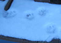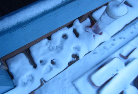 This morning, I got up much later than usual, though I have no idea why. Saturday Night Live was a rerun and I have no particular interest in Emma Stone or Coldplay; as we went to sleep, we were still giggling about lines from an early evening episode of Fawlty Towers, so you’d think all that aerobic exercise would’ve caused me to sleep lightly. No. I got up at just about 9. Here, we see the sad evidence of pussycats looking for me, waiting for me, not seeing me and running off to find food somewhere else. Nothing makes you feel like reheated crap like getting out of your cozy bed an hour and a half late and discovering you’ve disappointed cat people who aren’t even your pets. I was surprised to see these paw prints on this ledge. The cats that used to wait here moved away with their dumb people-people last summer. You can see these prints drip with dismay, but I may be overestimating and the snow may be thawing. Tomorrow, we expect the temperature to rise above 50.