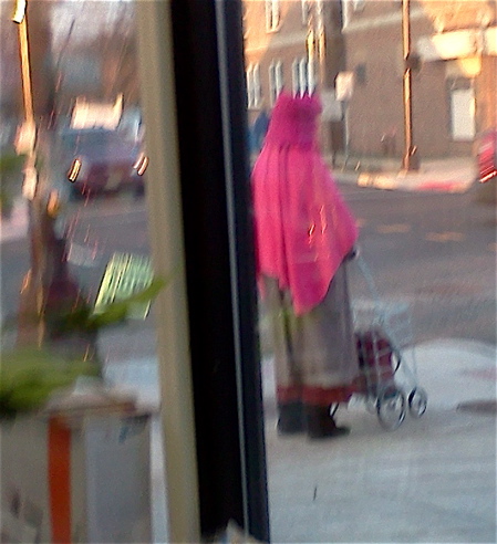 On Saturday afternoon, I was standing in the family store when a person sent me some very mixed messages. His or her face was completely concealed in what looked like a fuzzy scarf wrapped around some sort of frame, with fabric draped over his or her neck, shoulders and down to his or her hips, but open in the front. The tall person I could see was wearing a long, formless skirt and flat shoes in neutral brown, maroon and black colors. This outfit, in its shape, loosely resembled a chador, but those are always black or dark gray and designed to avoid attracting attention. This, however, was hot pink. I did not adjust for color when I cropped the picture. That’s really what I saw, but what was it?