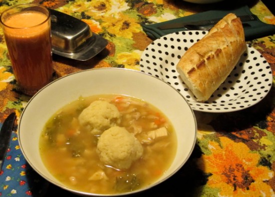To Stand Up I’ll Make It Posted by Tata on January 4, 2012 Chicken soup, matzoh balls, baguette, fruit and vegetable juice: a lovely dinner on a cold, blustery night. Share this: Click to share on X (Opens in new window) X Click to share on Facebook (Opens in new window) Facebook Click to email a link to a friend (Opens in new window) Email Like Loading... Related