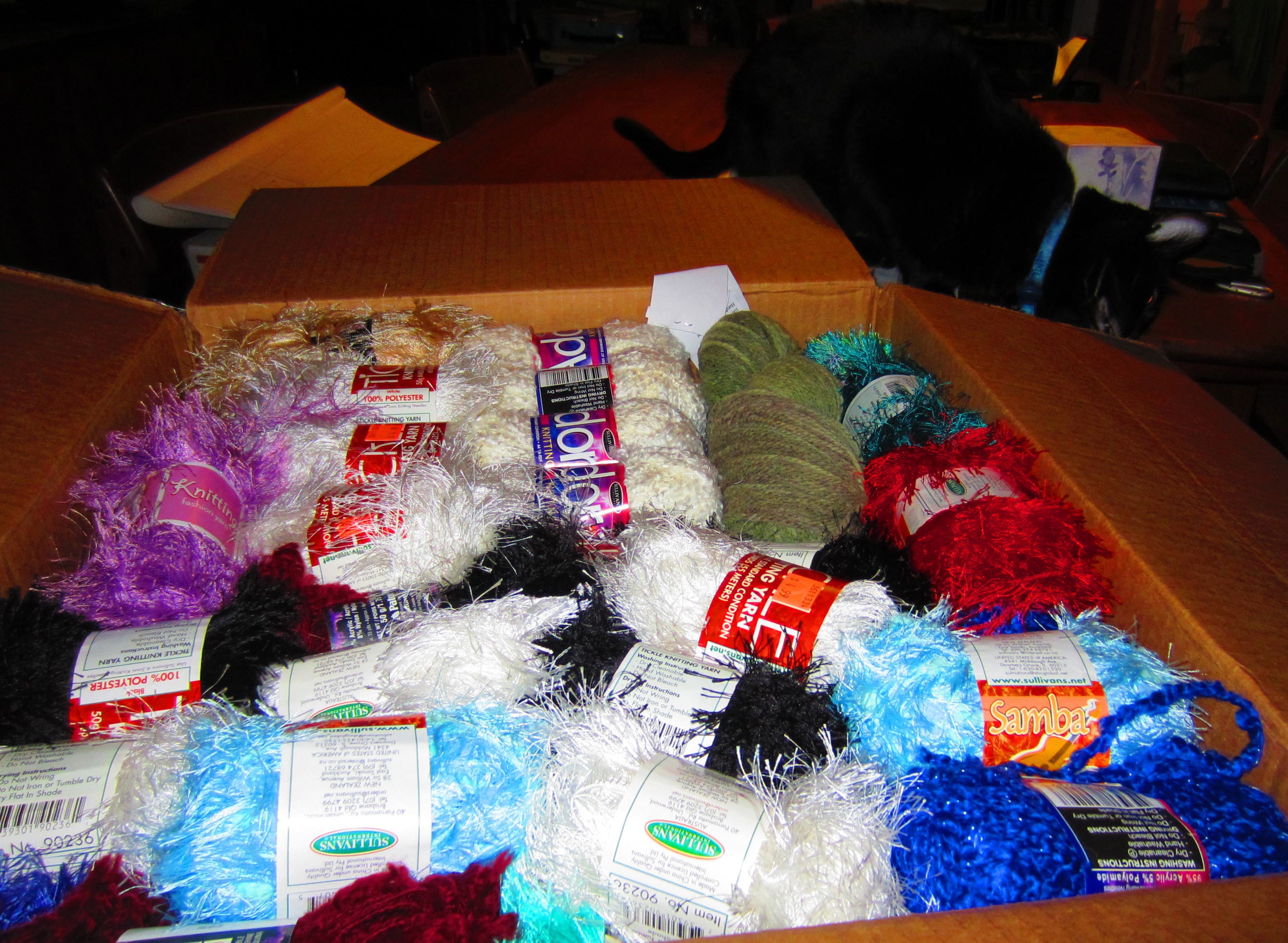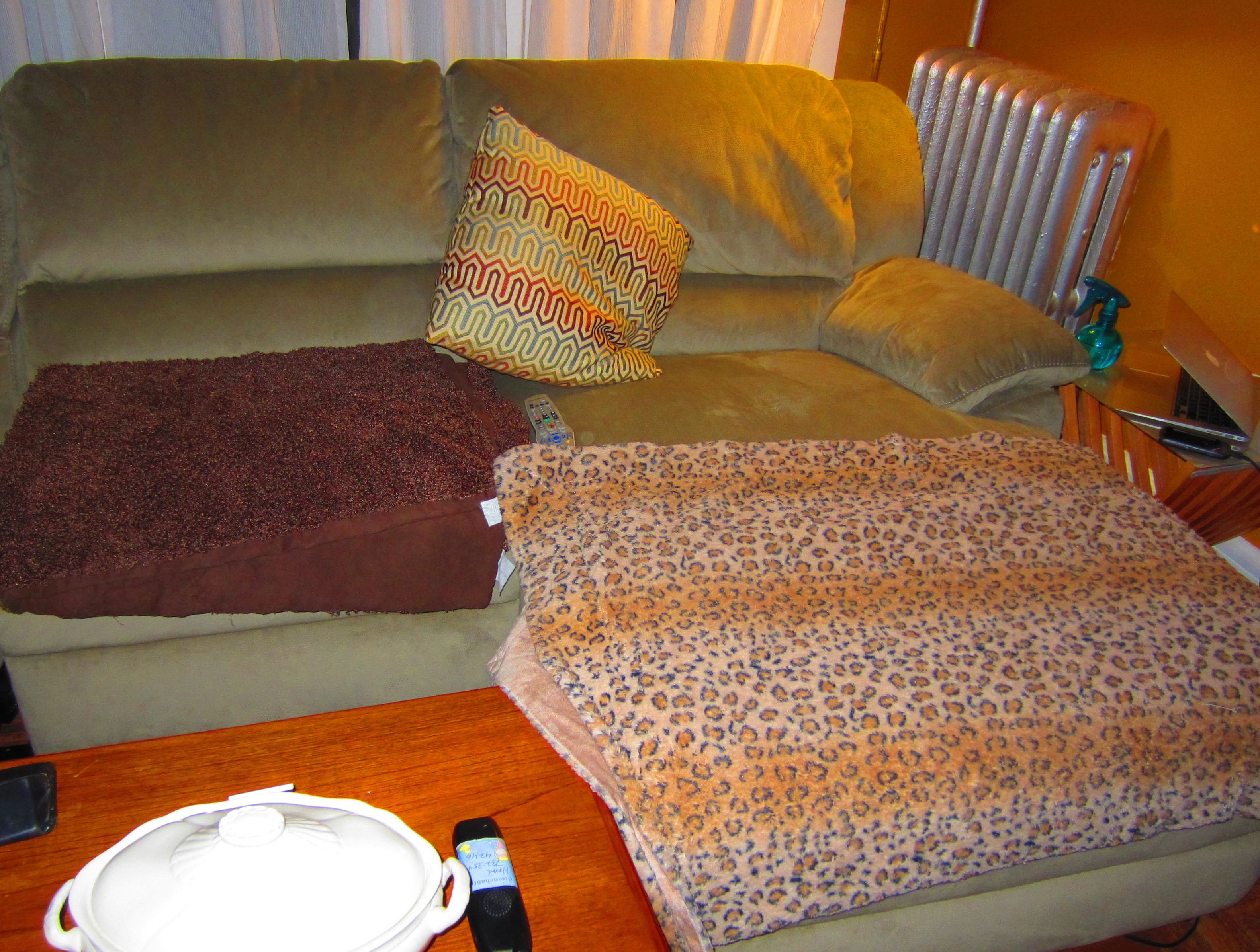 The new chaise where I will probably sleep next week arrived today. Pete immediately covered it with throws to fool the cats into thinking the couch was previously clawed.