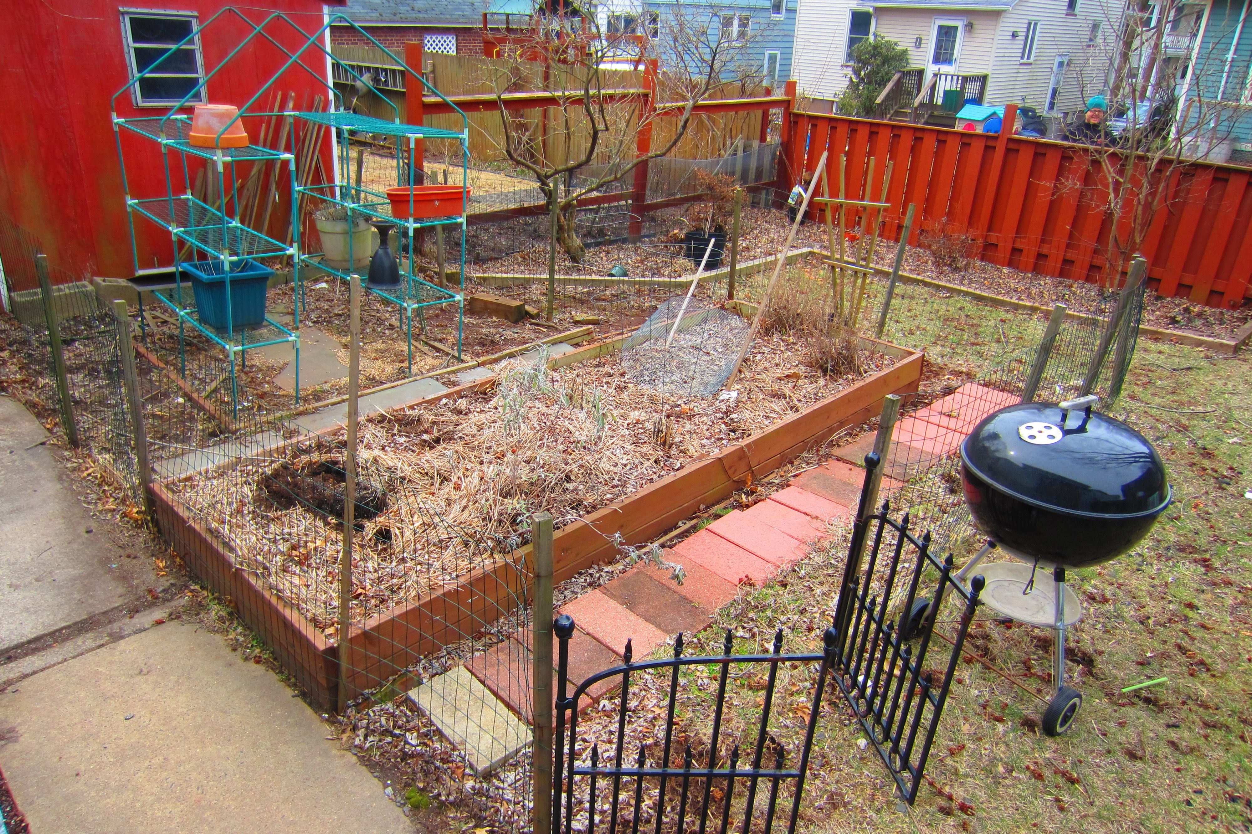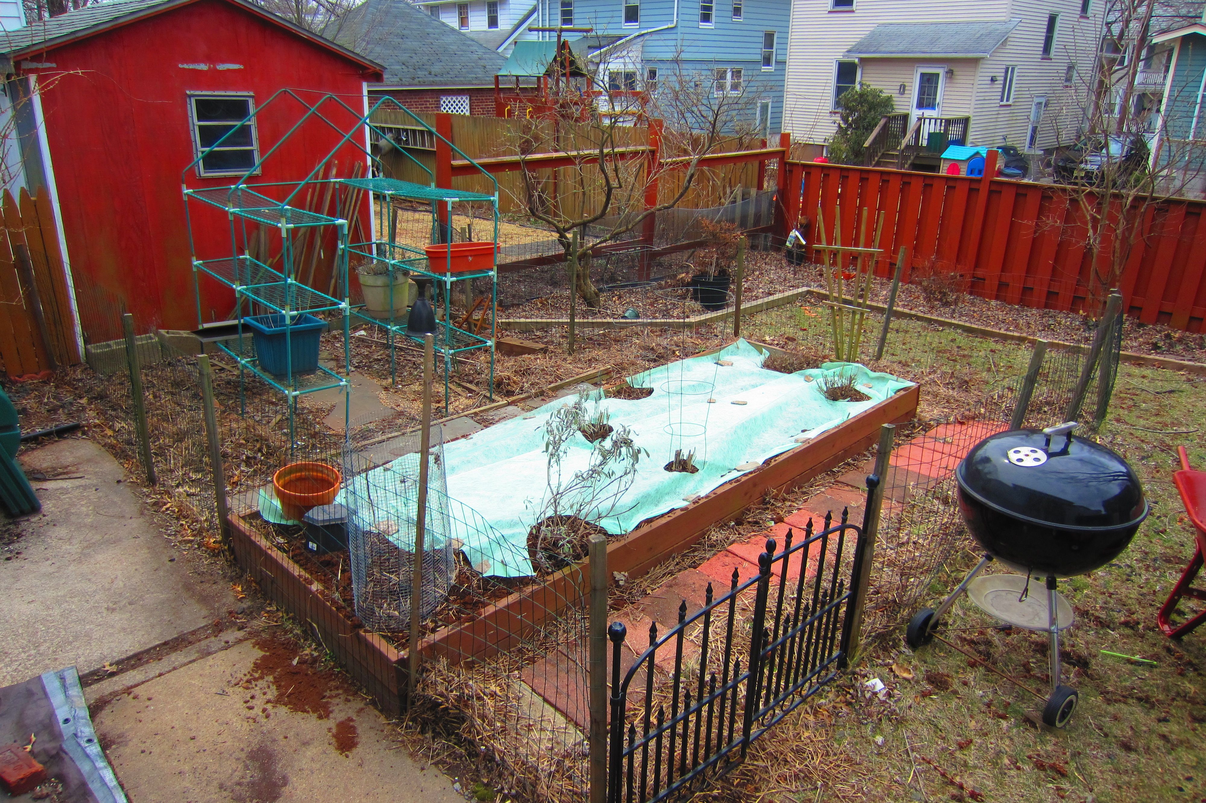Winter kicked my garden’s ass hard. This morning, I pulled a ton of material out of the composter, turned over half of the solarizing bed, cleaned extra straw and roots out the raised garden, turned over the soil, added peat moss and turned that in, then laid down the garden fabric to keep down weeds. Meanwhile, Pete set up the rain barrels, picked up broken palettes, raked out the front yard beds and repaired the screen porch where our cats sun themselves.