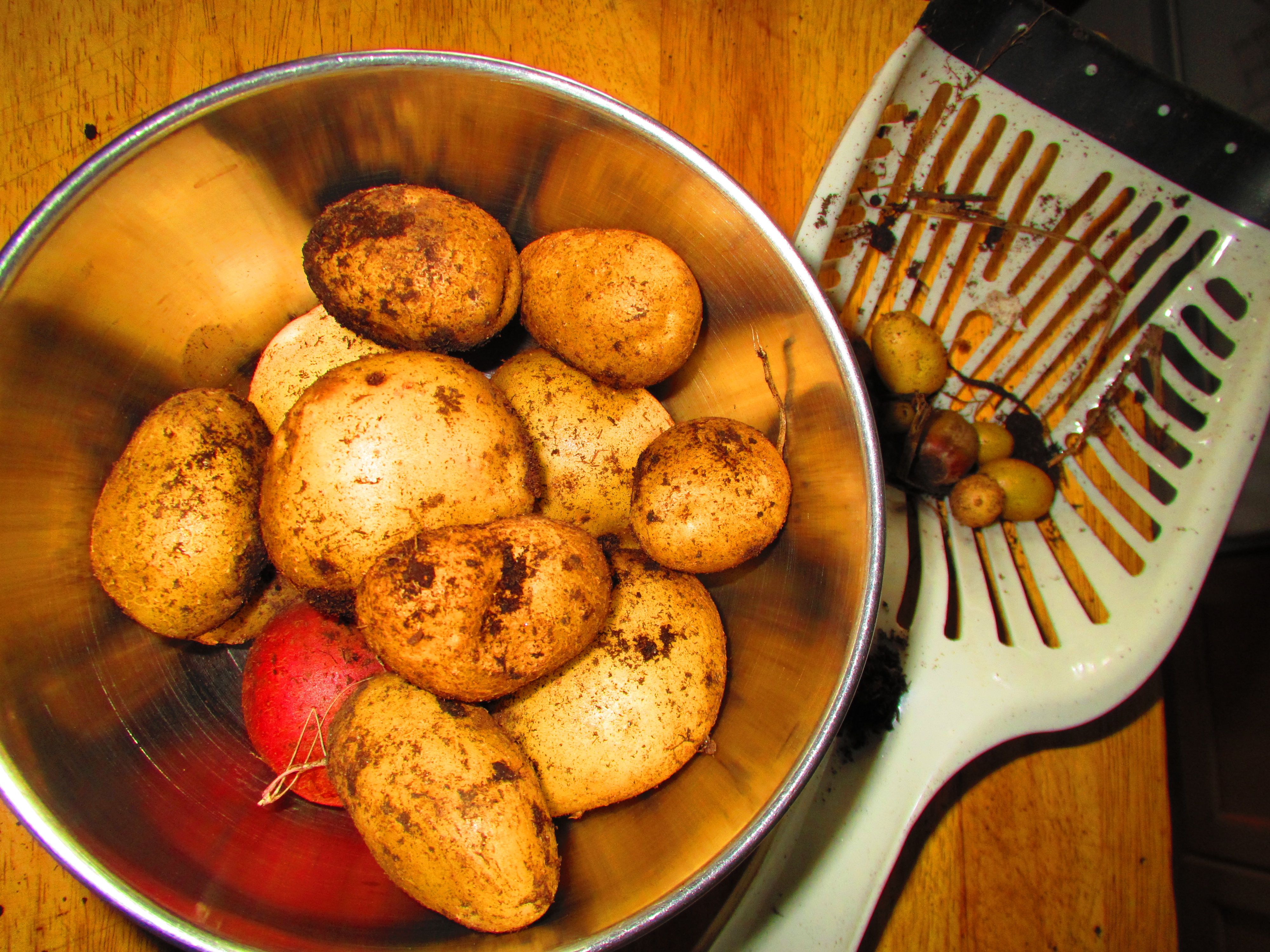Though I had searched the garden bed pretty thoroughly with my bare hands and clothed husband, I suspected the garden contained more potatoes. I further suspected a scooping and sifting tool might help me and realized I used such a tool almost every day to scoop cat boxes. I bought a new one – you are relieved! – and discovered the shape is right, but the tool is insufficiently sturdy. Even so: my bare hands found more potatoes in the garden where I had searched at least three times. This growing potatoes thing is FASCINATING.