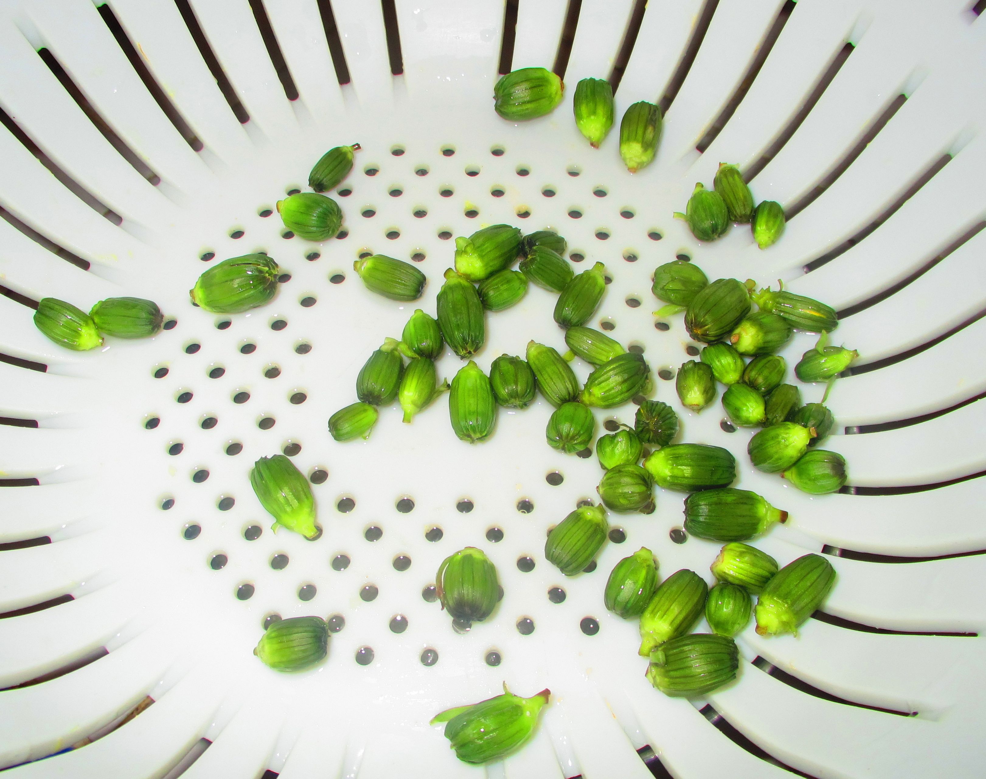 The funny forager said that a person could go back to the same place the next day and pick more buds, so I tried that out, too. For four days in a row, I picked the backyard clean, tinkered with my pickling liquids and dated the containers. I found that I wanted to leave the buds in brine longer than originally suggested, but for your purposes, Poor Impulsives, a real recipe will help.