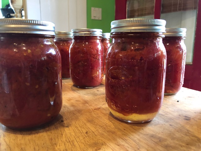The road crew moved to another block up the street, then around the corner, then further down. Or maybe it moved to another town, I can’t really tell. The crews are everywhere on this side of our small down, and all the roads bear the scars of digging and temporary patching sometimes two and three times. Tomorrow morning, I am going to drive the .3 miles to the farmers market, where Andie and I will buy five cases of tomatoes from the organic farmers and drive them home. If I were a nicer person, I might be concerned about the scorn of my neighbors, but my neighbors made the power company make an appointment to dig up their yard, thus subjecting the rest of us to three consecutive Fridays in which our garbage was not picked up. In 90 degree New Jersey. In July. So fuck them. I will also buy peaches.