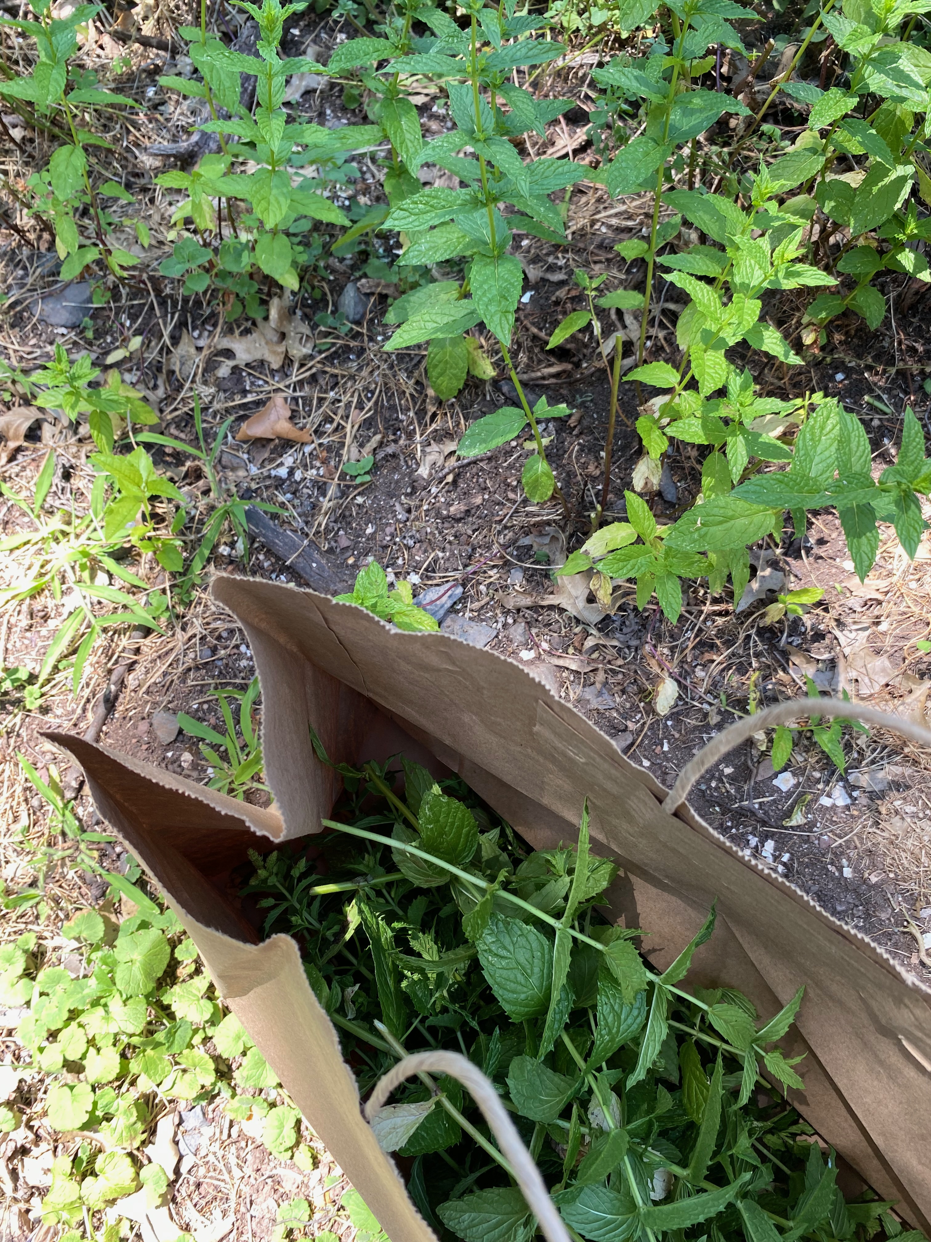 It’s mid-June, time to start gathering herbs to dry. I started with mint. This is a picture of mint packed into a paper bag that gets stapled shut and labeled for a time next spring when I will smooosh up mint leaves into tea. It’s good for the tummy and fantastic on lamb. I have other tricks up my cap sleeve.