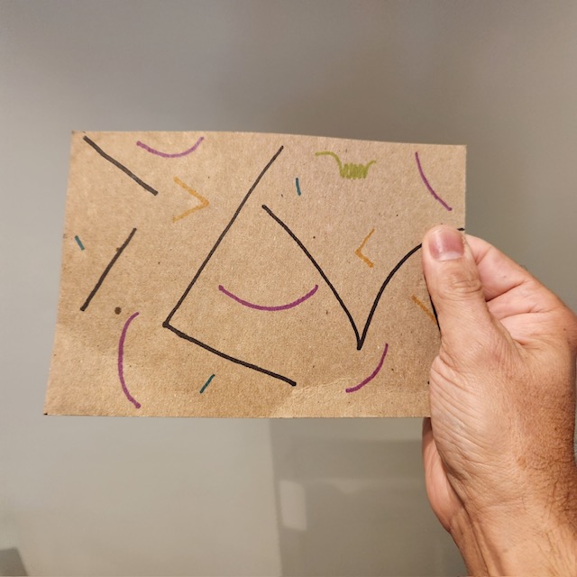 Just enough time passed for me to forget about bulk-mailing insulation before my cousin/hairdresser/not actually my cousin tested me this image, asking if I’d sent this. I had! He liked the purple smiles and the green squiggle, which was the only common element I employed in this batch of cardboard postcards. I told him a feature of this artform was that it was recyclable when he was done marveling that I had mailed him special cardboard. That part is fun for me! Do not keep my dumb stuff!