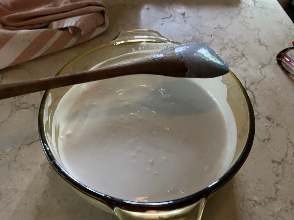 The next step is to loosely cover the bowl and go do your own thing for a day or two, depending on what you want your yogurt to taste like. The more time you give this part of the process, the tangier your yogurt will be, but your options are one day or two days. I set the bowl aside in a warm part of my kitchen and rocked on with my bad self. Just kidding: it was over 90° outside. No one was rocking on.