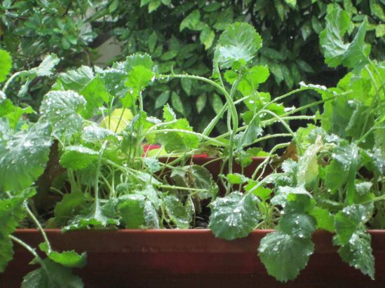 This evening, I went out to pick herbs for dinner and found someone had invited himself or herself or deerself to dine. At first, I wasn’t sure what was amiss. The tenant’s giant squash plant looked a little squishy and a lot less giant, though it took a second look to determine why. The long golden flowers were all tucked into the planter but the elephantine leaves that shaded them were all gone. Suddenly, I was suspicious and crept around the outside of the garden fence. The tops of carrot flowers were nibbled off, but most of the garden was fine. Fortunately, I was staring at stems and crab-walking like a refugee from Mumenschantz when my neighbor, hosing down his broccoli, said, “Hey Domy, whatcha doin’?”