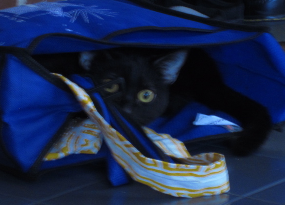 Lovely Topaz examines the shopping bags from the inside, where she seems a little blurry around the edges.
